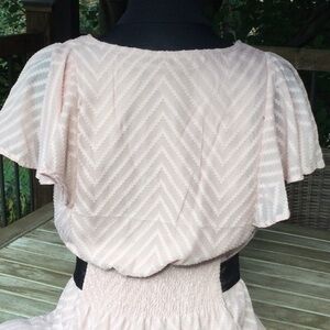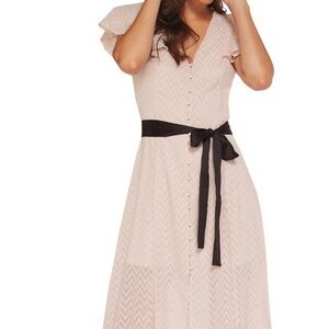 Dex dress size M. Flattering fit, with flutter sleeves, black satin sash at waist, covered buttons down the front. Beautiful details! Waist is elasticized at back for a smooth, comfortable fit. Sheer overlay with lining to mid thigh, and through the bodice. Fabric is so pretty and lightweight. Worn once to an event. Small mark on back of skirt, barely noticeable when worn (see photo).