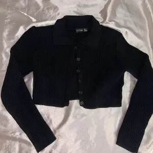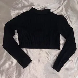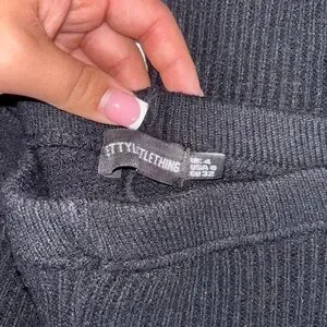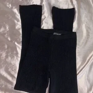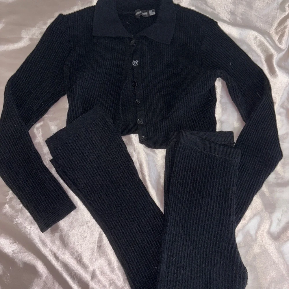 Chic black ribbed knit set. Includes long-sleeve top and matching pants. Perfect for cozy style. Pilling on pants in crotch area, not visible when worn.