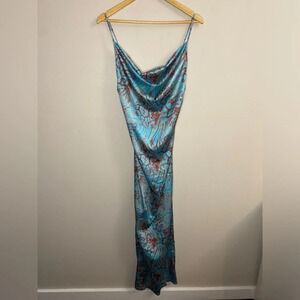 PrettyLittleThing Blue Leopard Print Strappy Satin Cowl Midi Dress