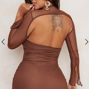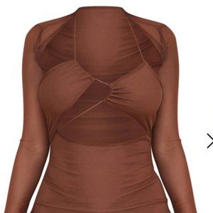 PrettyLittleThing Brown Mesh Lace Up Detail Overlay Bodycon Dress