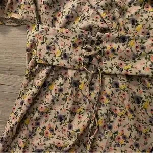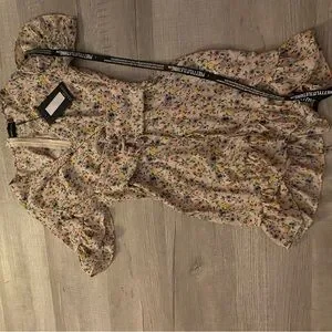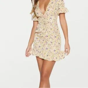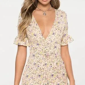 This charming sundress by PrettyLittleThing features a cream base adorned with a ditsy floral print in pastel hues. The dress boasts a daring plunge neckline and flutter sleeves, perfect for a wedding guest or resort wear occasion. Its ruffled hem adds a playful touch to the elegant design. It has a corseted waist to add to your curves.