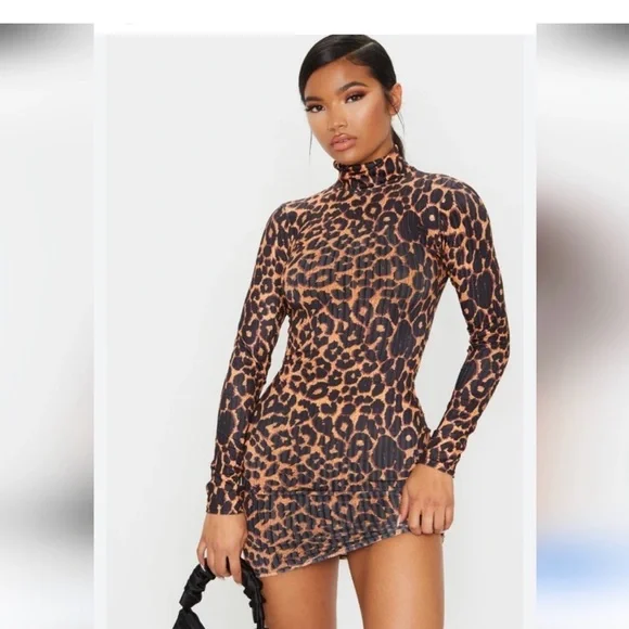 Fierce leopard print mini dress. Long sleeves and high neck. Perfect for bold style.