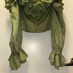 Chic olive blouse with dramatic ruffles. Off-shoulder design. Perfect for stylish outings.