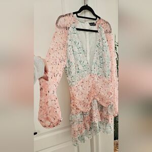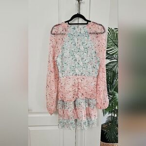 Chic floral dress with a mix of pink and green hues. Features long sleeves and layered ruffles. Perfect for a stylish look.