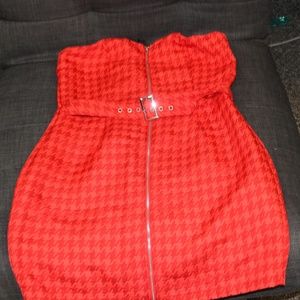 PrettyLittleThing red houndstooth dress with front buckle detail