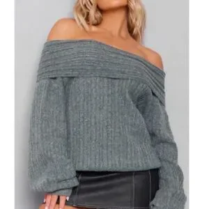 PrettyLittleThing Ribbed Off-Shoulder Sweater in Gray