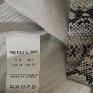 mini skirt with a bold snake design. Features gold button details and zipper on side. Perfect for a trendy look.