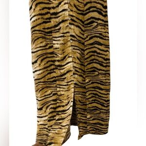 Stunning tiger print midi dress. Features thin straps, a V-neck, and button detailing down the centre. Centre front slit. Lightweight material.