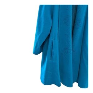Open style/in overlay coat with embroidered lapels. A beautiful metallic belt would accentuate the aesthetic. Beautiful aquamarine blue and teal lining. Functional front pockets. Lighted padded shoulders.