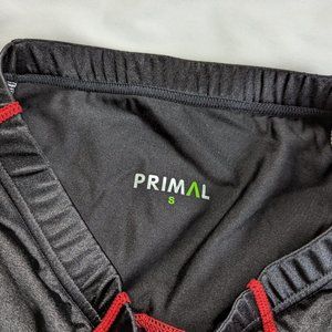 Shiny black, red, and blue Primal cycling shorts with padding.