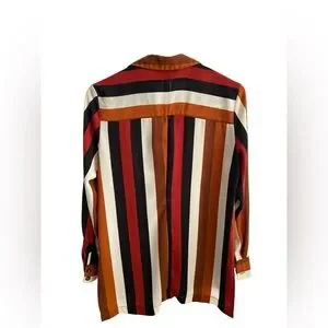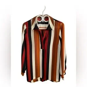 Fashion striped long sleeve blouse. Soft v-neckline with no buttons. Full length sleeves with two button closure, extra button on inside tag. Hi-low so the backside is longer. Minimal stretch, gently used, in good condition.