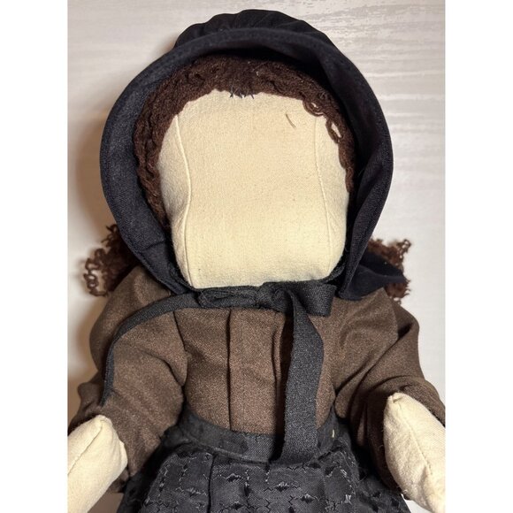 This handmade Amish-inspired rag doll features traditional brown and black attire with a bonnet. It adds a touch of rustic charm to home decor.