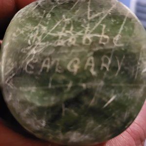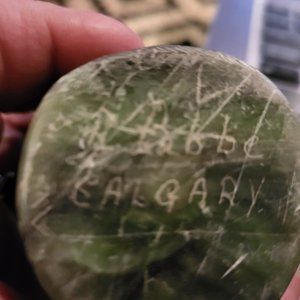 Collectible R Labbe soapstone carving, earlier work, primitive. Signed, not dated. Green with grey/black veins throughout, but strong green coloration. Very sweet. Stands only 3"high, and an approximate diameter of 2". Weighs about a pound. Vintage