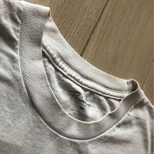 Barely visible stain by the hem and collar.