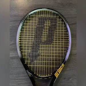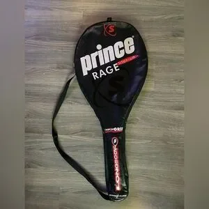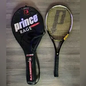 Sleek Prince Rage Titanium racket. Bold black and yellow design. Comes with protective cover.