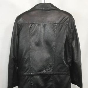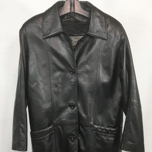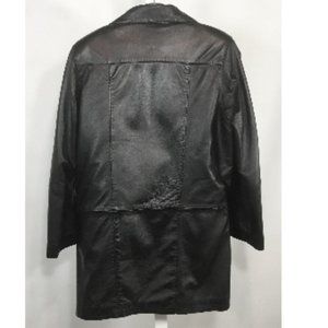 Supple leather three-quarter length coat has detachable winter lining. Excellent condition.