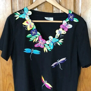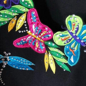Black with gorgeous appliqué butterflies and dragonflies with rhinestones.