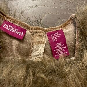 Gold dress with toule and fake fur neck trim and puffed sleeves.