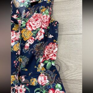 This elegant sleeveless dress features a vibrant floral pattern on a navy background.