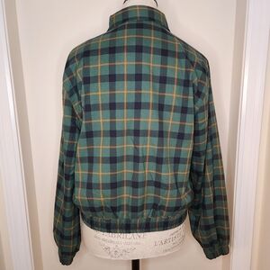 Green with navy blue and burnt orange/gold stripe checkered plaid zipup collared bomber jacket with stretch sleeves and hemline, by Princess Highway.