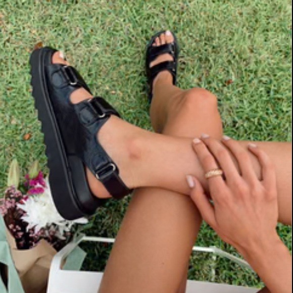 Step into style with these Princess Polly black platform sandals, featuring multiple horizontal straps for a secure fit. The chunky sole adds height and comfort, making them perfect for casual summer outings. Crafted from a synthetic leather-like material, these sandals offer a modern and comfortable design.