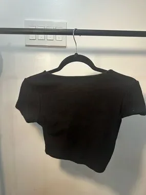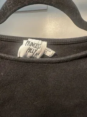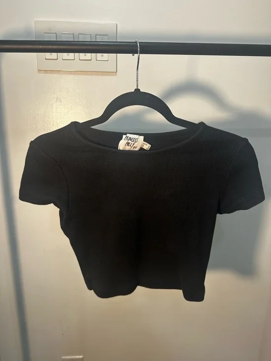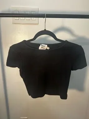 Black ribbed short sleeve crop tee by Princess Polly. Fitted silhouette with crew neckline. Soft stretch fabric for everyday wear. Easy to style with high-waist bottoms.
