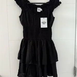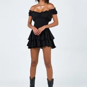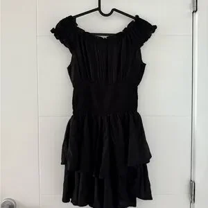 Chic black mini dress with ruffled layers. Off-shoulder design. Perfect for a night out. Brand new, no defects, never worn