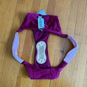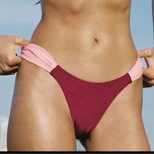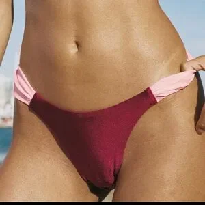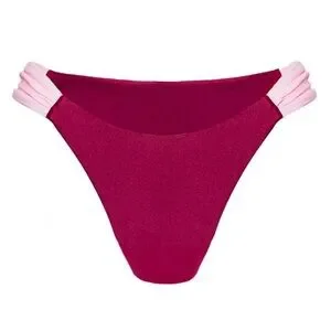 Chic ruched bikini bottom in a bold burgundy red hue. Two colorway detail, cheeky bottom, fixed coverage. Good-stretch material, fully lined and soft!