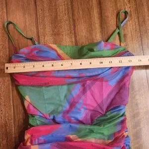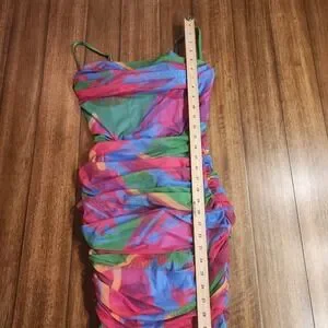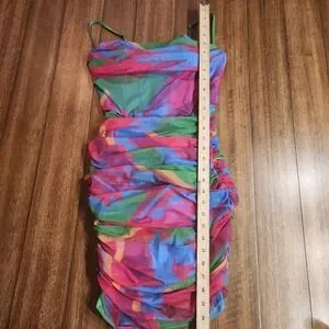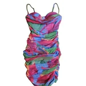 Turn heads in this vibrant ruched mesh mini dress. The captivating abstract print in bold shades of green, pink, and blue creates a dynamic and eye-catching look. Designed with a flattering sweetheart neckline and adjustable spaghetti straps, this dress offers a perfectly sculpted silhouette. The intricate ruching throughout the fabric accentuates your curves, creating a stunning bodycon fit.