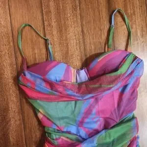 Keywords: ruched dress, mesh dress, bodycon, mini dress, abstract print, strappy dress, pink dress, green dress, blue dress, going out dress, party dress, summer dress, festival dress, night out