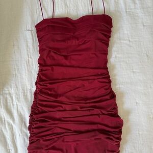 Fitted ruched mini dress with thin spaghetti straps. Straight neckline and bodycon silhouette. Stretchy fabric for a snug, flattering fit. Ideal for evenings and parties.