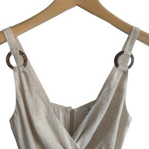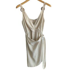 This is a light beige faux wrap mini dress by Princess Polly.
