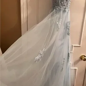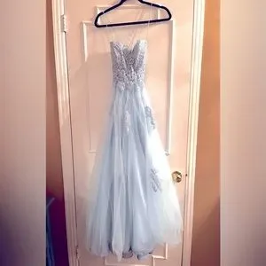 Prom Dress! Baby blue with detailed silver rhinestone design, Size XS, but is adjustable to a Small. Slit all the way up the thigh. Longer back. Length can fit 5’2 to 5’4. Low back. Wrap included