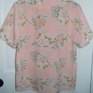 Peachy pink vintage 80's button down short sleeve shirt with the most beautiful floral pattern. Scalloped edges give it an even more feminine flair. 100% polyester. Size 12 (vintage) pls see measurements as vintage fits smaller....Condition is good - no stains/rips. Measurements as follows: