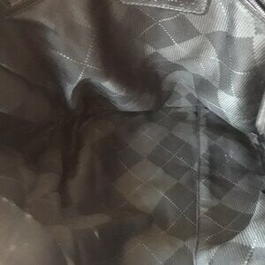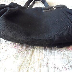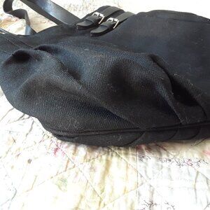 Rare Pringle of Scotland black wool woven kilt bag with leather shoulder strap and leather buckle details. Fabric interior lining. Open top with one interior zip pocket.