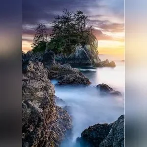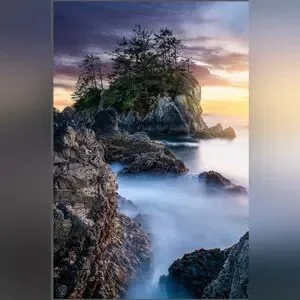The light of the setting sun illuminates a rugged rocky island cover in ancient trees near the of Ucluelet, BC.