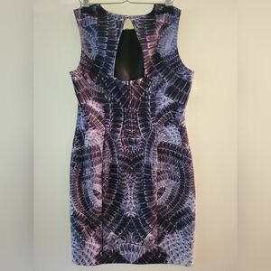 Fitted printed dress. Curves the body nice. Can wear for any occasion. Above the knee length. A little open back at the very top. Size 14