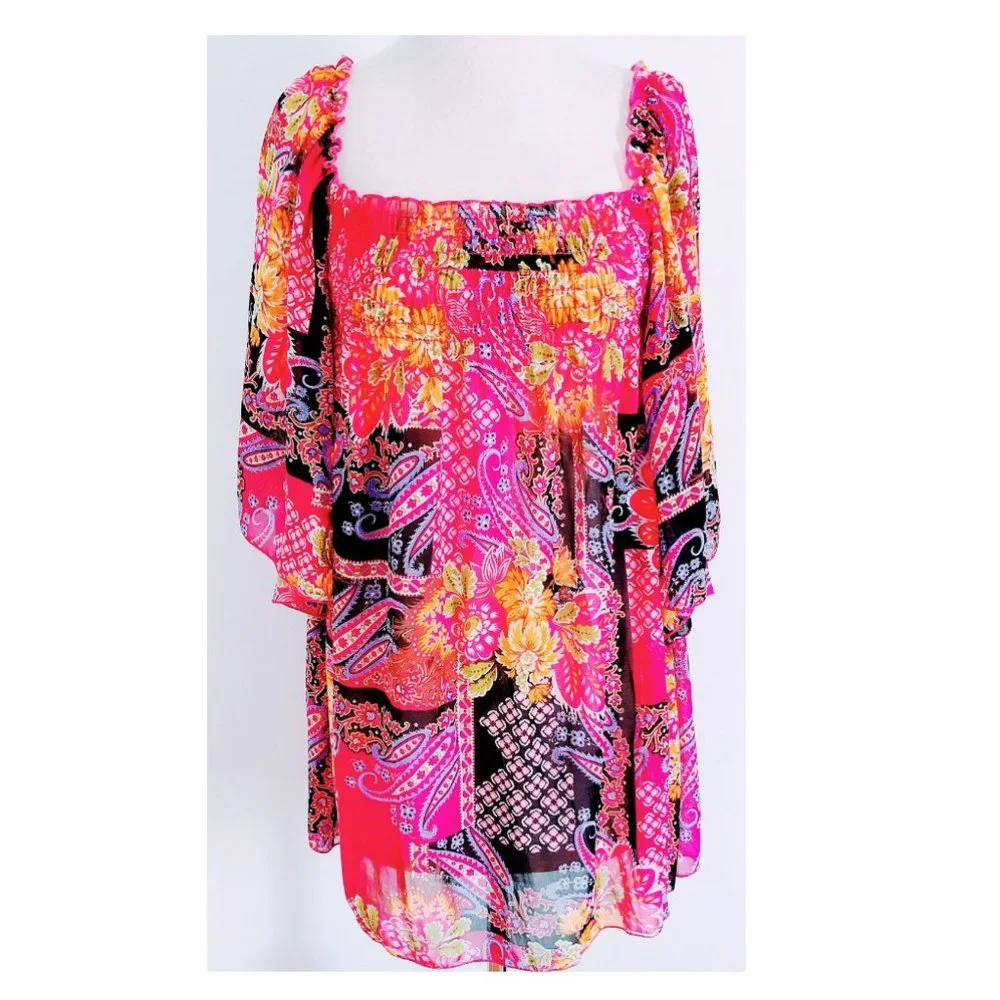Print tunic. Sheer. Honeycomb stitching top. Butterfly sleeves. Gorgeous and brand new!!