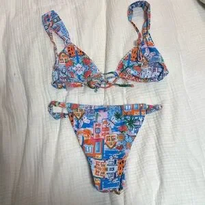 Only tried on, still has sanitary sticker attached. Swimsuit is adjustable and has slight lace detailing around the top.
