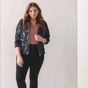 Zip front closure with elasticized hem/cuff banding and pockets. Poly/elastane blend. Marked as 1X.