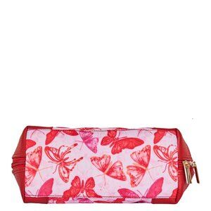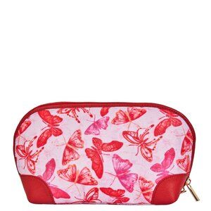 Printed Fabric Pink Cosmetic Pouch Bag for Women, Travel Case with Leather trim