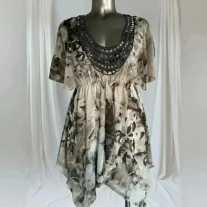 Grey colours on white background. Fully lined, flair loose sleeves and handkerchief hemline. Chiffon Polyester fabric. Scoop neckline with embroidered sequins trim.