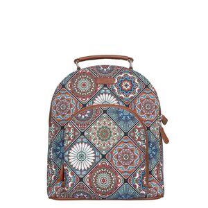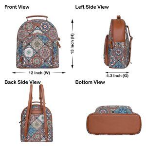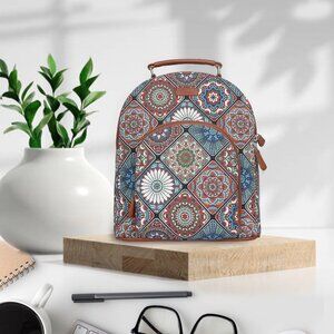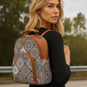 Premium Quality & Design: This women's backpack is crafted from durable Hand Crafted Printed Fabric with vegan leather trim and pullers, featuring a sleek silhouette and a top vegan leather handle for convenient grab-and-go functionality.