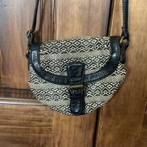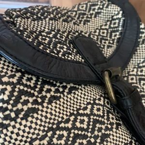 Black and beige purse! Light weight, straw like material for a more durable exterior. Worn once. Strap measures 21 inches (when worn on your shoulder).