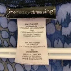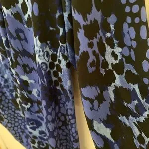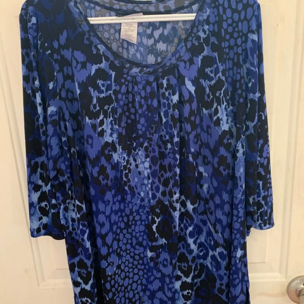 Beautiful blue/black printed top. Wrinkle free polyester/spandex nice drape and comfortable weight. Has slits on side for comfort at hip sitting/driving doesn’t pull. 3/4 loose fit sleeve. Very pretty top. Soft pleating on front at neck band