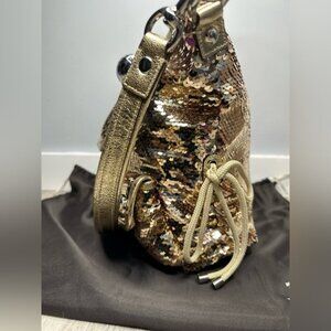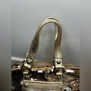 Coach designer handbag featuring an exterior coated in gilt sequins and adorned with two pockets, each of which bears two large buttons emblazoned with Coach logo. Interior houses one zippered pocket and two open pockets and straps are embellished with a disco ball keychain. Includes shoulder strap, dust bag