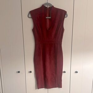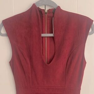 Flattering and bold, this sleeveless red faux suede dress from Privy features a structured fit, a high neckline with a chic front slit, and a gold zip back closure for ease and polish. The soft, suede-like texture gives it a luxe feel, perfect for dinner dates, events, or a holiday party. New with tags, never worn. Size M.