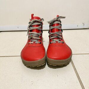 Beautiful red leather hiking boots bought in anticipation of winter and never worn. They are very comfortable and well made but they did not really fit my style and I did not reach for them.