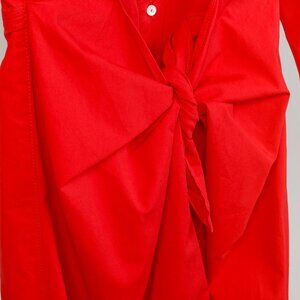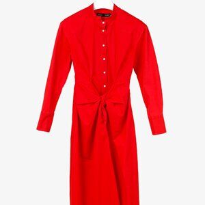 This shirtdress from Proenza Schouler’s 2019 Resort collection is crafted in a Poppy red cotton-blend stretch poplin, and features long sleeves, buttoned cuffs, dropped shoulders, a high standing collar, an exposed front button-down placket, a front self tie-waist, and an A-line midi skirt with a back slit at the hem.