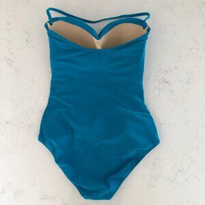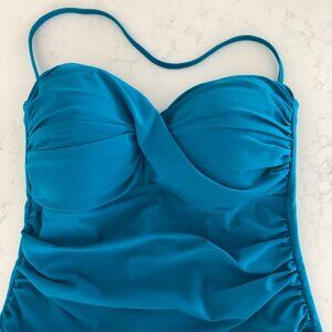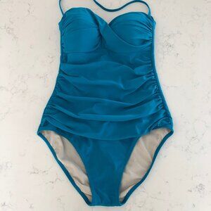 Profile Lined Strapless One Piece Swim Suit w Side Ruching + Detachable Neck Strap Padded Bust in Turquoise Blue - no fabric or size tags